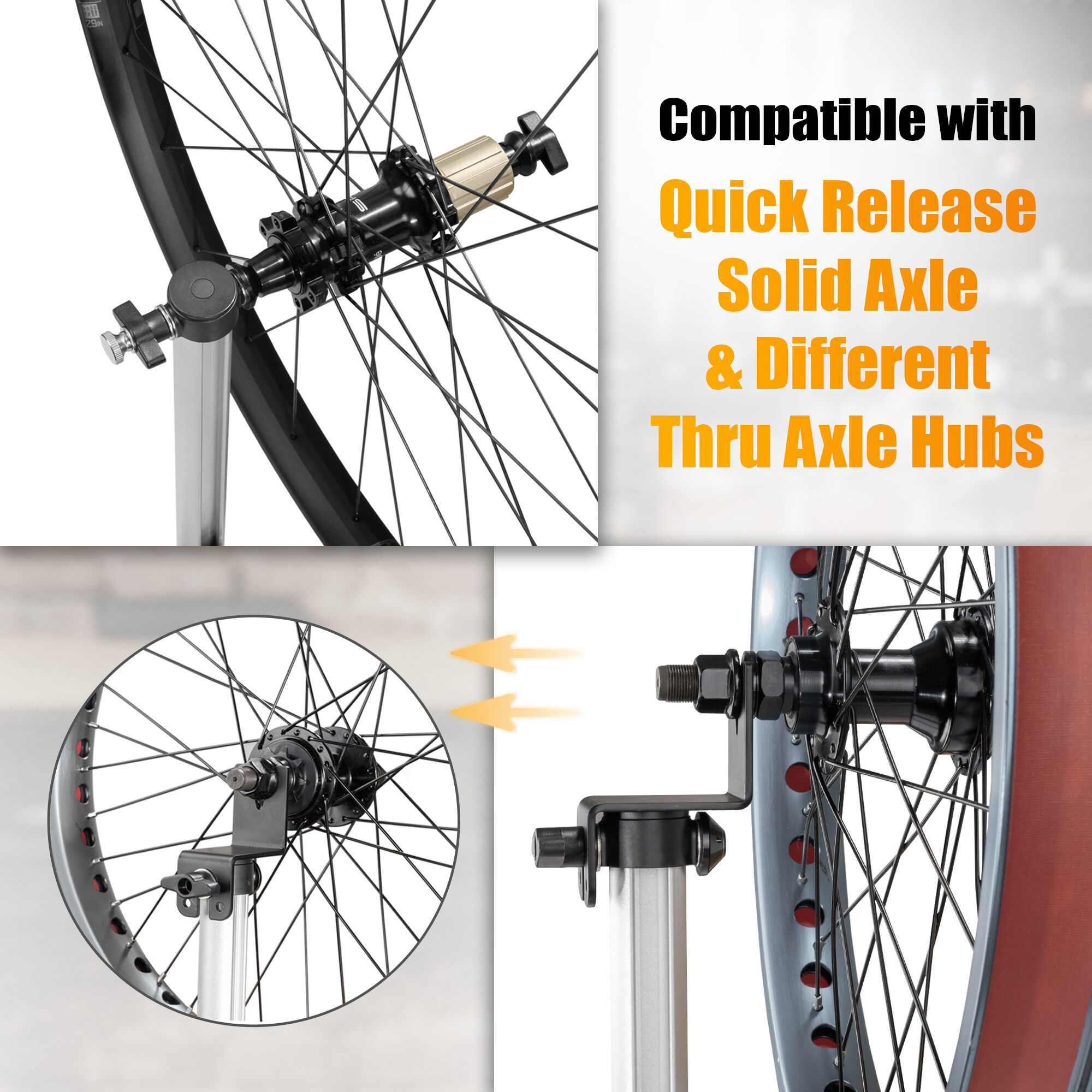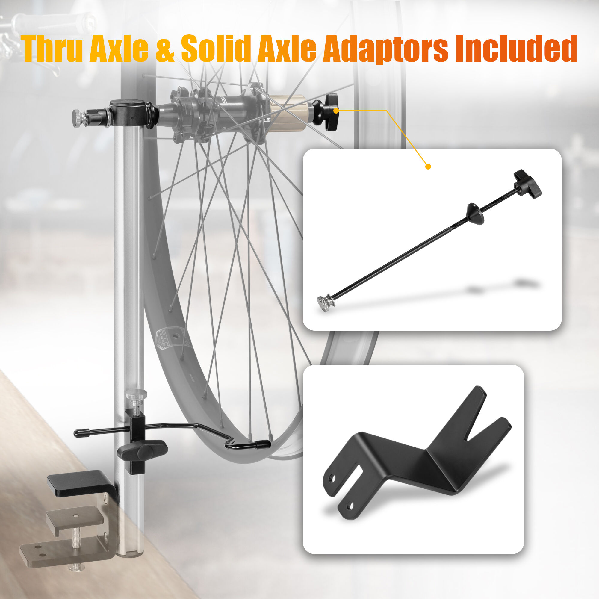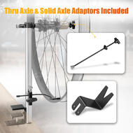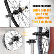 - COMPATIBLE WITH DIFFERENT AXLE HUBS - Its thru axle and solid axle adaptors make it suitable for quick-release, solid axle, and different thru axle hubs, providing adaptability for different setups. Spin true and ride with confidence with this reliable bicycle wheel truing stand, providing optimal performance for your wheels.